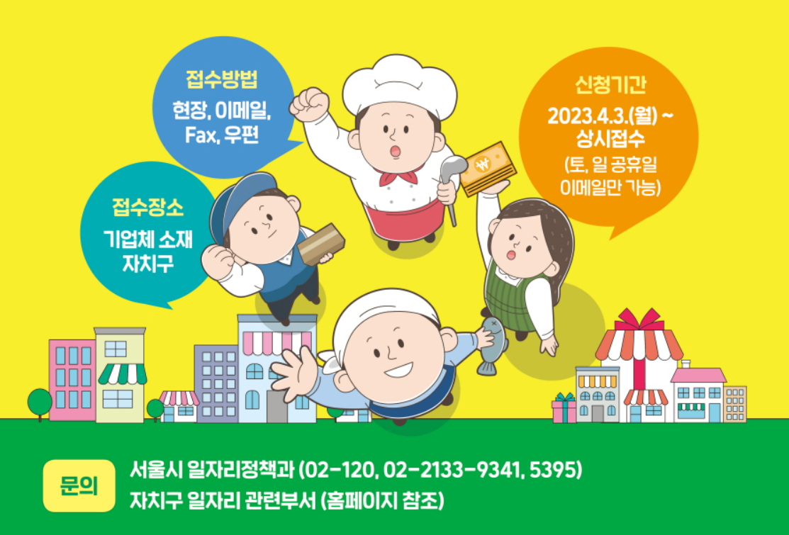 서울시 소재 소상공인이라면 누구나 신청하실 수 있습니다. 접수는 기업체 소재 자치구를 통해 가능하며, 방문접수 / 이메일 / 우편 / 팩스 등으로 서류를 제출하여 신청하실 수 있습니다.